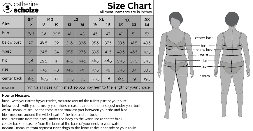 Size chart for Catherine Scholze designs